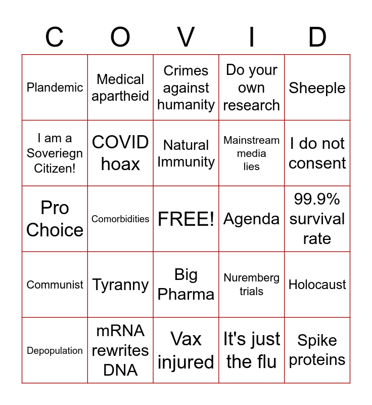 This bingo card has a free space and 24 words: Tyranny, mRNA rewrites DNA, Natural Immunity, Depopulation, Sheeple, Plandemic, I am a Soveriegn Citizen!, Medical apartheid, Agenda, Big Pharma, Mainstream media lies, Pro Choice, Nuremberg trials, Holocaust, COVID hoax, It's just the flu, 99.9% survival rate, Crimes against humanity, I do not consent, Comorbidities, Spike proteins, Communist, Do your own research and Vax injured.