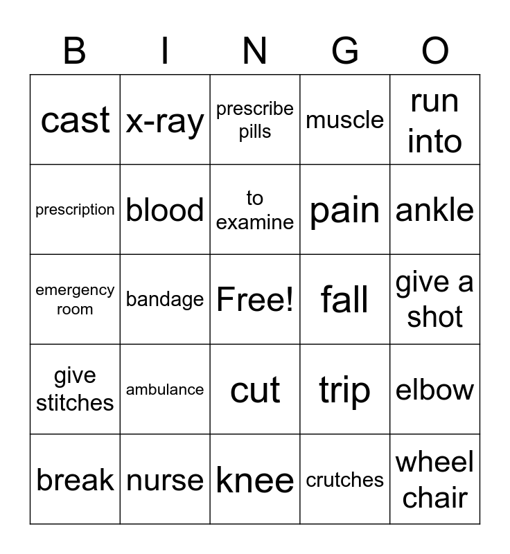 This bingo card has a free space and 24 words: ambulance, nurse, to examine, break, run into, cast, prescription, x-ray, fall, cut, pain, emergency room, trip, elbow, blood, crutches, give a shot, prescribe pills, ankle, bandage, wheel chair, give stitches, muscle and knee.