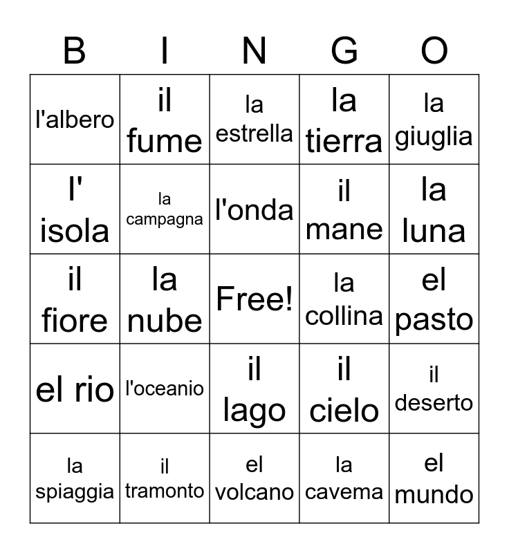 This bingo card has a free space and 24 words: l'oceanio, il tramonto, l'onda, la spiaggia, la giuglia, l'albero, I' isola, il fume, la collina, il lago, il mane, il fiore, il cielo, il deserto, la campagna, la cavema, el pasto, la estrella, la luna, la nube, el mundo, el rio, la tierra and el volcano.