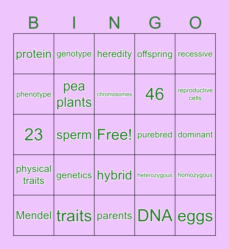 This bingo card has a free space and 24 words: genetics, traits, chromosomes, Mendel, recessive, protein, phenotype, genotype, purebred, hybrid, 46, 23, heterozygous, homozygous, pea plants, DNA, dominant, heredity, reproductive cells, sperm, eggs, physical traits, offspring and parents.