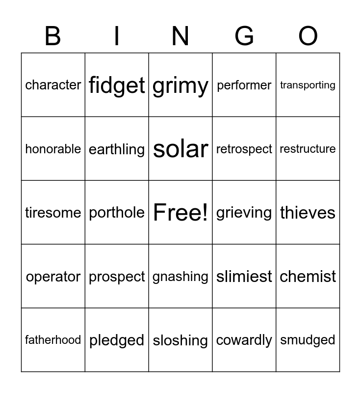 This bingo card has a free space and 34 words: formation, cowardly, gripping, suspect, operator, earthling, transporting, fatherhood, fidget, objection, solar, grimy, contractor, radical, grieving, restructure, pledged, tiresome, prospect, slimiest, gnashing, rejection, character, thieves, sloshing, smudged, performer, intensify, retrospect, honorable, downward, porthole, chemist and knuckles.