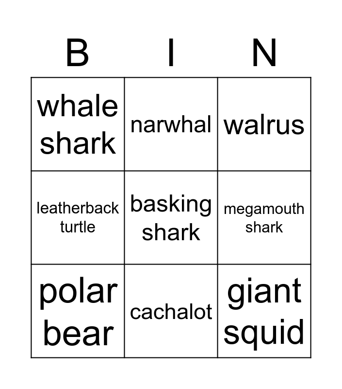 This bingo card has a free space and 8 words: megamouth shark, walrus, narwhal, polar bear, whale shark, giant squid, leatherback turtle and cachalot.