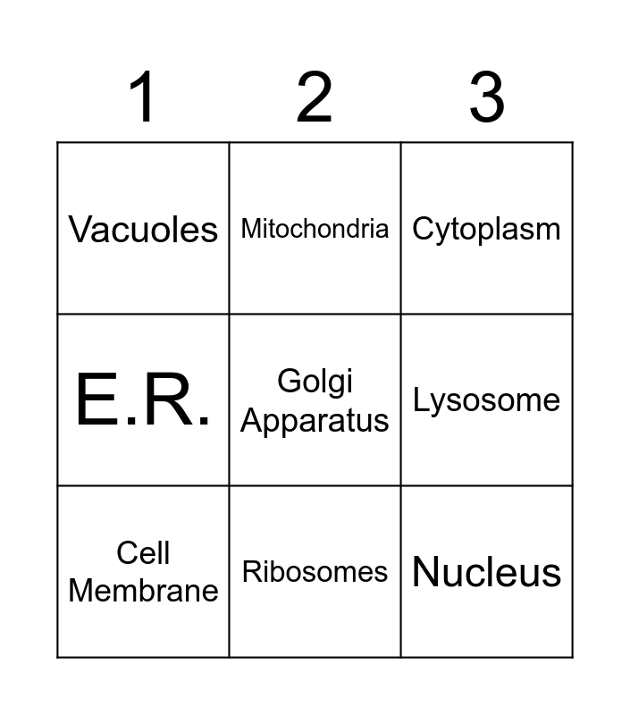 This bingo card has 9 words: Cell Membrane, Cytoplasm, Mitochondria, E.R., Vacuoles, Lysosome, Golgi Apparatus, Nucleus and Ribosomes.