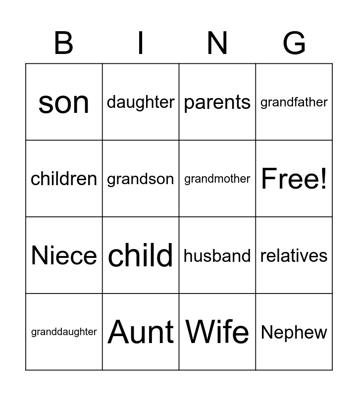 This bingo card has 24 words: mother, father, Wife, Nephew, son, daughter, grandmother, grandfather, Niece, Aunt, Uncle, Free!, Brother, sister, husband, cousin, granddaughter, grandson, family, relatives, children, child, parents and grandparents.