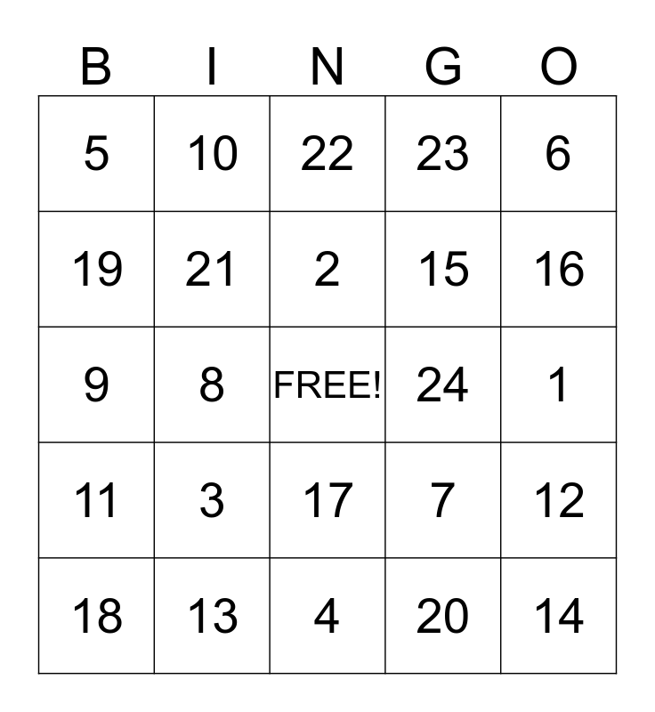 This bingo card has a free space and 24 words: 3, 13, 2, 18, 6, 5, 19, 10, 24, 17, 15, 9, 7, 12, 21, 20, 1, 22, 16, 8, 14, 11, 23 and 4.