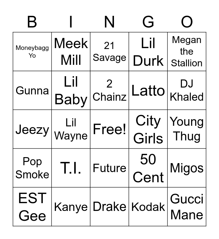 This bingo card has a free space and 24 words: T.I., Kanye, 2 Chainz, EST Gee, Megan the Stallion, Moneybagg Yo, Gunna, Meek Mill, City Girls, Future, Latto, Jeezy, 50 Cent, Migos, Lil Baby, Kodak, Young Thug, 21 Savage, DJ Khaled, Lil Wayne, Gucci Mane, Pop Smoke, Lil Durk and Drake.
