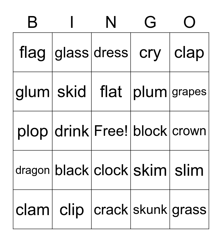 This bingo card has a free space and 24 words: black, clip, flat, clam, clap, flag, glum, glass, block, clock, plum, plop, skim, slim, skid, skunk, crown, dress, grapes, drink, grass, dragon, cry and crack.