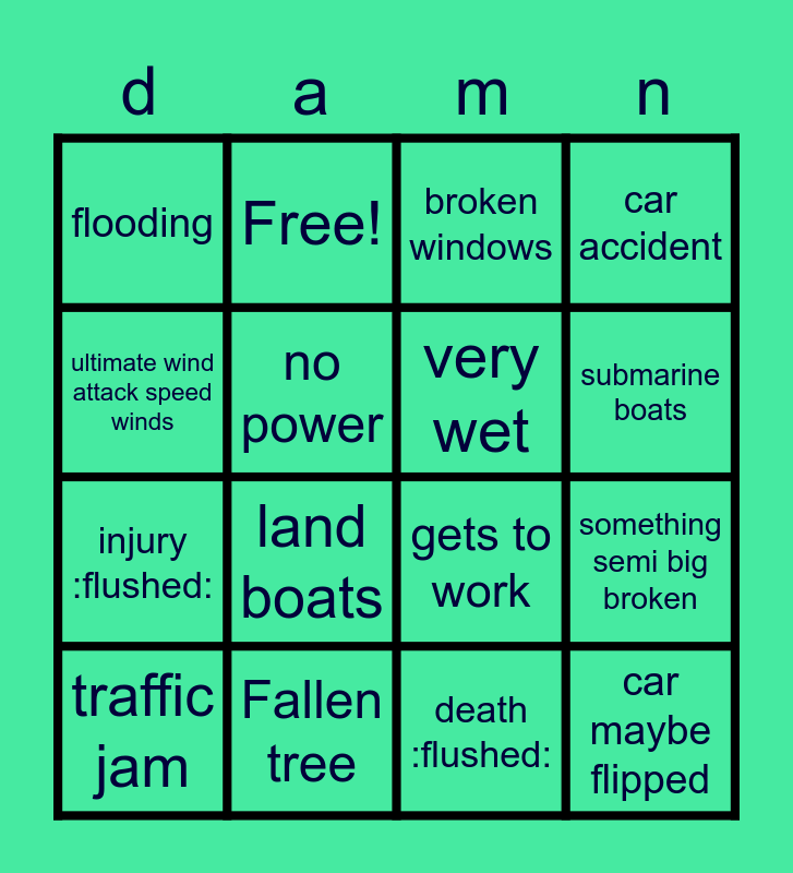 This bingo card has 16 words: Fallen tree, something semi big broken, broken windows, flooding, injury :flushed:, Free!, gets to work, death :flushed:, ultimate wind attack speed winds, no power, traffic jam, car accident, land boats, submarine boats, very wet and car maybe flipped.