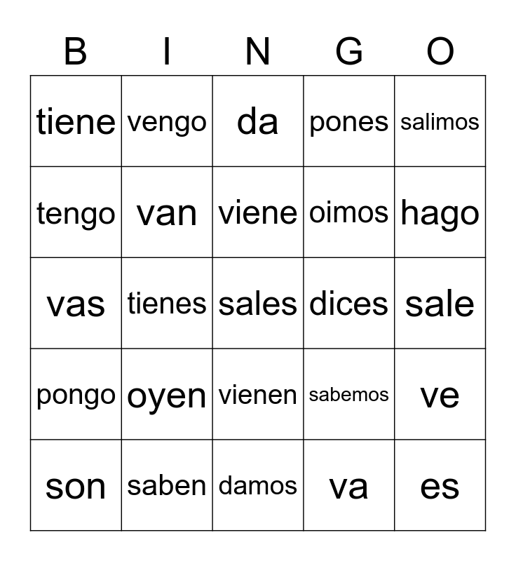 This bingo card has a free space and 66 words: Free!, veo, ves, ve, vemos, ven, vengo, vienes, viene, venimos, vienen, salgo, sale, salimos, salen, tengo, tienes, tiene, tenemos, oimos, oyen, pongo, pones, pone, ponemos, ponen, soy, eres, es, somos, son, sé, sabes, sabe, sabemos, saben, voy, vas, va, vamos, van, digo, dices, dice, decimos, dicen, hago, haces, hace, hacemos, hacen, estoy, estás, está, estamos, están, doy, das, da, damos, dan, conozco, conoces, conoce, conocen and conocemos.