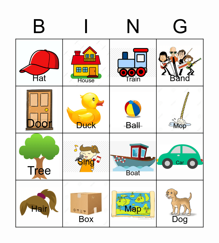 This bingo card has 16 images and 16 words: Box, Car, Train, Hat, Tree, House, Boat, Map, Door, Duck, Hair, Band, Sing, Mop, Ball and Dog.