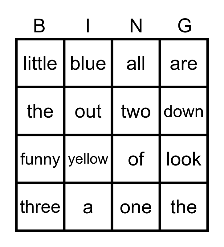 This bingo card has 1 images and 17 words: yellow, the, all, little, of, are, three, blue, down, funny, one, the, look, out, two, a and I.