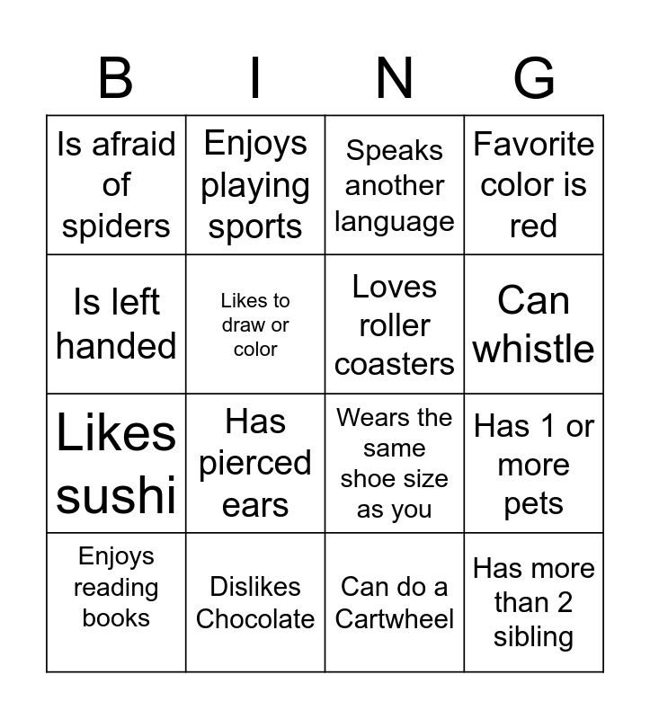 This bingo card has 16 words: Dislikes Chocolate, Has 1 or more pets, Speaks another language, Is afraid of spiders, Likes sushi, Enjoys playing sports, Wears the same shoe size as you, Can do a Cartwheel, Is left handed, Likes to draw or color, Enjoys reading books, Favorite color is red, Has pierced ears, Can whistle, Loves roller coasters and Has more than 2 sibling.