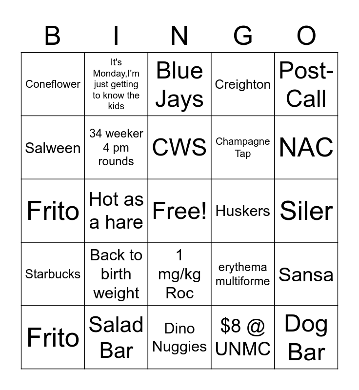 This bingo card has a free space and 60 words: Scooter's Coffee, Salad Bar, Cindy's Candy Bowl, Starbucks, $8 @ UNMC, Garden Variety, 34 weeker 4 pm rounds, Saturday Shennangians, Champagne Tap, UNMC, Creighton, DMU, Salween, Mula's, E-Creamery, Coneflower, Dog Bar, Post-Call, Omaha Zoo, CWS, Huskers, Blue Jays, Frito, Sansa, Memorial Park, Crescent Moon, NBN, Epi Spritzer, NAC, Eczema, Blue Book, SVT, DK no A, Blackstone, It's Monday,I'm just getting to know the kids, Dog Bag, 7 AM CTS rounds, Hot as a hare, Dr. Akers, Frito, Blue Jays, Back to birth weight, Siler, Bronze, erythema multiforme, hemolyzed potassium, Fentanyl Versed, 2-bag system, Asthmalitis, 1 mg/kg Roc, Dino Nuggies, AUC, Post Call, Precedex, CWS, LR bols, Amp/Gent, Erythema toxicum, Follow-up is your friend and Vanc/Ceftriaxone.
