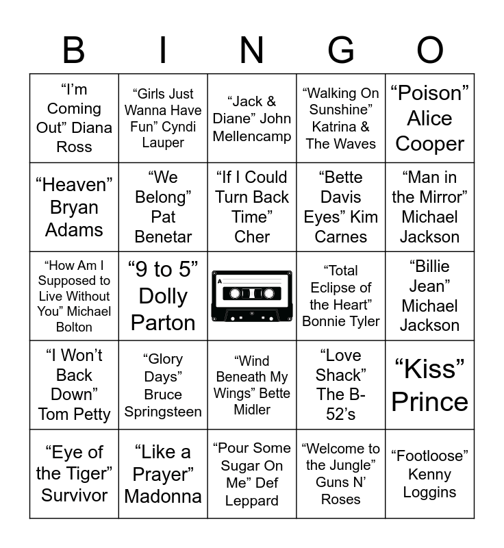This bingo card has a free space and 29 words: “Eye of the Tiger” Survivor, “Uptown Girl” Billy Joel, “9 to 5” Dolly Parton, “Kokomo” The Beach Boys, “I’m Coming Out” Diana Ross, “Jack & Diane” John Mellencamp, “We Belong” Pat Benetar, “Glory Days” Bruce Springsteen, “Total Eclipse of the Heart” Bonnie Tyler, “Like a Prayer” Madonna, “Billie Jean” Michael Jackson, “Footloose” Kenny Loggins, “Pour Some Sugar On Me” Def Leppard, “Welcome to the Jungle” Guns N’ Roses, “Man in the Mirror” Michael Jackson, “Every Rose Has Its Thorn” Poison, “Wind Beneath My Wings” Bette Midler, “I Won’t Back Down” Tom Petty, “Poison” Alice Cooper, “How Am I Supposed to Live Without You” Michael Bolton, “Love Shack” The B-52’s, “Super Trouper” ABBA, “Bette Davis Eyes” Kim Carnes, “Heaven” Bryan Adams, “Walking On Sunshine” Katrina & The Waves, “Girls Just Wanna Have Fun” Cyndi Lauper, “Kiss” Prince, “If I Could Turn Back Time” Cher and “Living On Video” Trans-X.