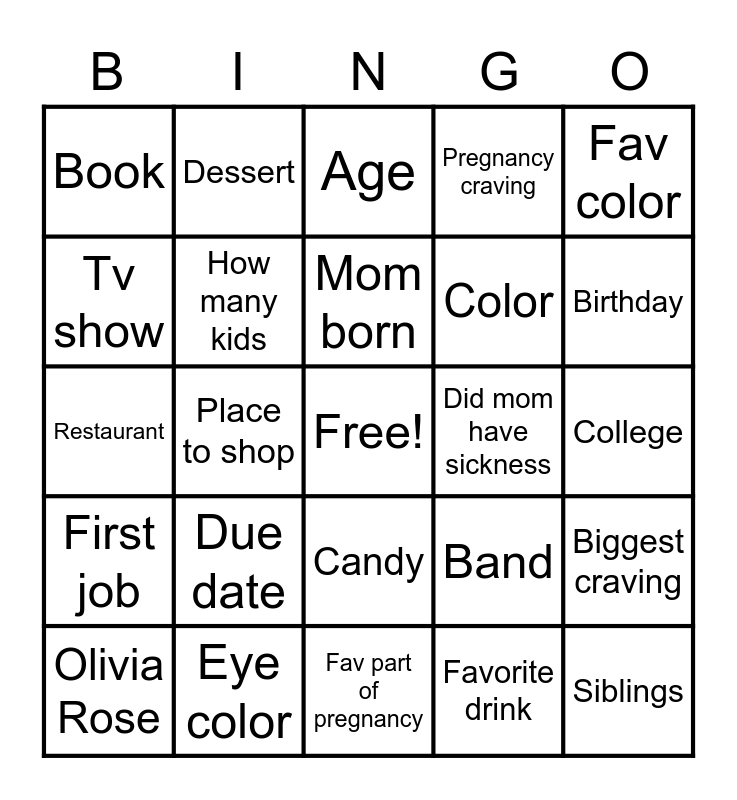 This bingo card has a free space and 24 words: Due date, Eye color, Mom born, Olivia Rose, Fav color, Book, Tv show, Dessert, Did mom have sickness, Candy, Color, Restaurant, Band, Biggest craving, How many kids, Favorite drink, College, Age, Birthday, Place to shop, Siblings, First job, Pregnancy craving and Fav part of pregnancy.