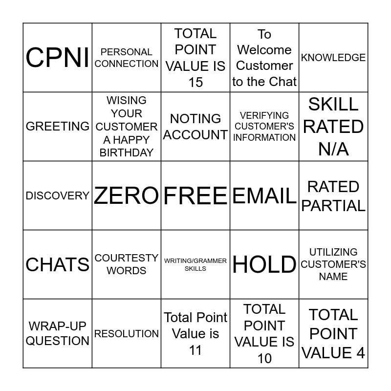 This bingo card has a free space and 24 words: COURTESTY WORDS, RESOLUTION, NOTING ACCOUNT, WRAP-UP QUESTION, KNOWLEDGE, CPNI, GREETING, PERSONAL CONNECTION, EMAIL, WRITING/GRAMMER SKILLS, VERIFYING CUSTOMER'S INFORMATION, DISCOVERY, HOLD, UTILIZING CUSTOMER'S NAME, WISING YOUR CUSTOMER A HAPPY BIRTHDAY, TOTAL POINT VALUE IS 10, RATED PARTIAL, TOTAL POINT VALUE IS 15, SKILL RATED N/A, ZERO, TOTAL POINT VALUE 4, CHATS, To Welcome Customer to the Chat and Total Point Value is 11.