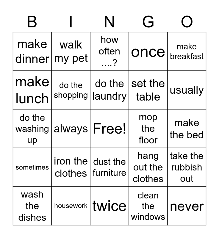 This bingo card has a free space and 24 words: iron the clothes, housework, do the laundry, wash the dishes, make breakfast, make dinner, make lunch, walk my pet, mop the floor, dust the furniture, set the table, do the washing up, hang out the clothes, take the rubbish out, do the shopping, clean the windows, make the bed, how often ....?, usually, always, never, sometimes, once and twice.