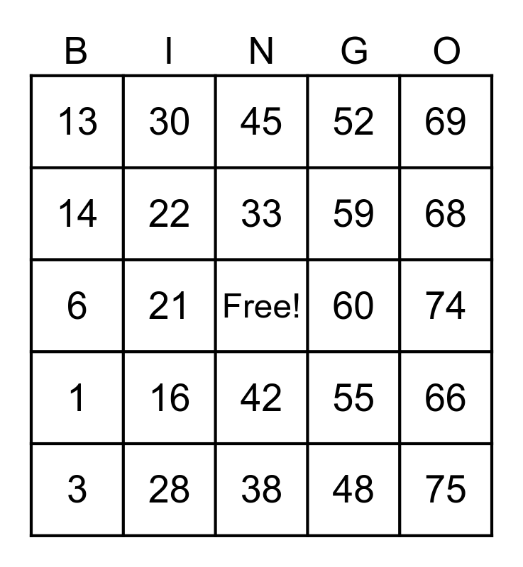 This bingo card has a free space and 24 words: 3, 16, 33, 48, 69, 13, 30, 45, 60, 74, 6, 22, 55, 66, 14, 28, 38, 52, 68, 1, 21, 42, 59 and 75.