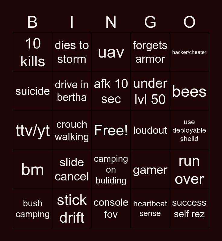 This bingo card has a free space and 24 words: slide cancel, stick drift, afk 10 sec, bush camping, hacker/cheater, 10 kills, suicide, dies to storm, loudout, camping on buliding, under lvl 50, ttv/yt, gamer, run over, drive in bertha, heartbeat sense, use deployable sheild, uav, bees, crouch walking, success self rez, bm, forgets armor and console fov.