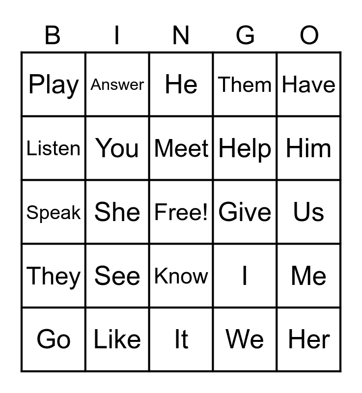 This bingo card has a free space and 24 words: See, Like, Meet, Go, Have, Play, Listen, Answer, Give, Know, Help, Speak, I, Me, You, We, Us, He, Him, She, Her, They, Them and It.