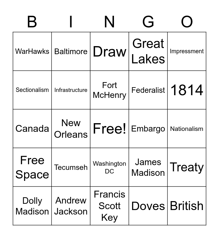 This bingo card has a free space and 25 words: Tecumseh, Francis Scott Key, Fort McHenry, Dolly Madison, Impressment, WarHawks, Sectionalism, Baltimore, Embargo, Washington DC, Federalist, Canada, James Madison, Treaty, Infrastructure, Increased Manufacturing, Nationalism, Draw, 1814, New Orleans, British, Andrew Jackson, Free Space, Great Lakes and Doves.