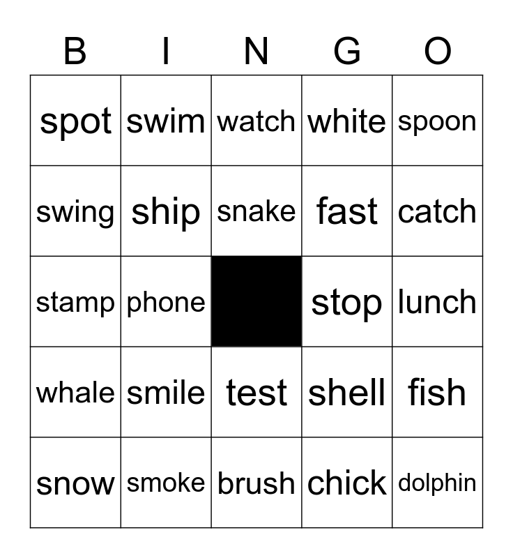 This bingo card has a free space and 24 words: smile, smoke, snake, snow, spoon, spot, swing, swim, stop, test, fast, stamp, shell, fish, ship, chick, lunch, watch, catch, phone, dolphin, whale, white and brush.