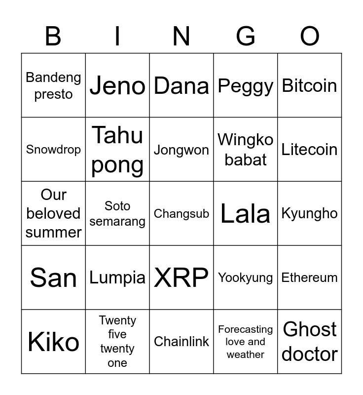This bingo card has a free space and 24 words: Lumpia, Twenty five twenty one, Jongwon, Kiko, Bitcoin, Bandeng presto, Snowdrop, Jeno, Lala, XRP, Wingko babat, Our beloved summer, Yookyung, Ethereum, Tahu pong, Forecasting love and weather, Kyungho, Dana, Litecoin, Soto semarang, Ghost doctor, San, Peggy and Chainlink.