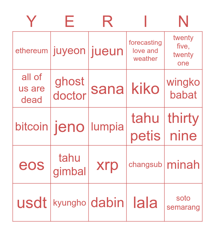 This bingo card has a free space and 24 words: tahu gimbal, kyungho, sana, usdt, twenty five, twenty one, ethereum, all of us are dead, juyeon, tahu petis, xrp, kiko, bitcoin, changsub, minah, ghost doctor, lala, thirty nine, jueun, wingko babat, jeno, soto semarang, eos, forecasting love and weather and dabin.