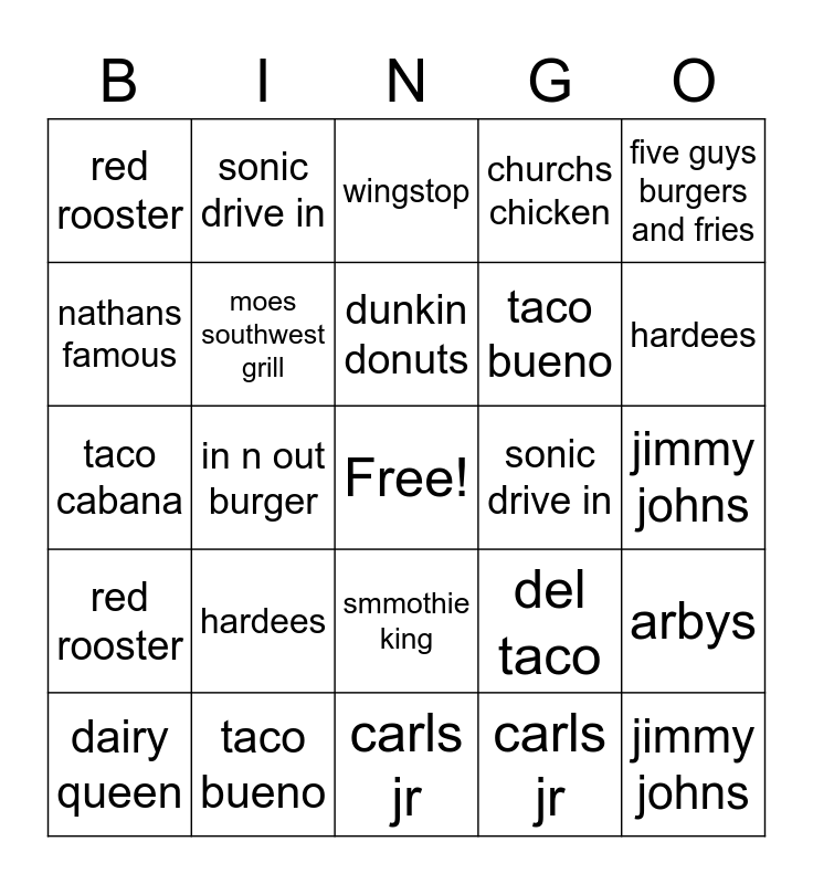 ⚠ This card has duplicate items: popeyes chicken (2), taco bueno (2), red rooster (3), carls jr (2), moes southwest grill (3), jack in the box (2), nathans famous (2), del taco (2), jimmy johns (3), five guys burgers and fries (2), sonic drive in (2), wingstop (3), dairy queen (2), hardees (3), panda express (2), zaxbys (2), burger king (2), fatburger (2)