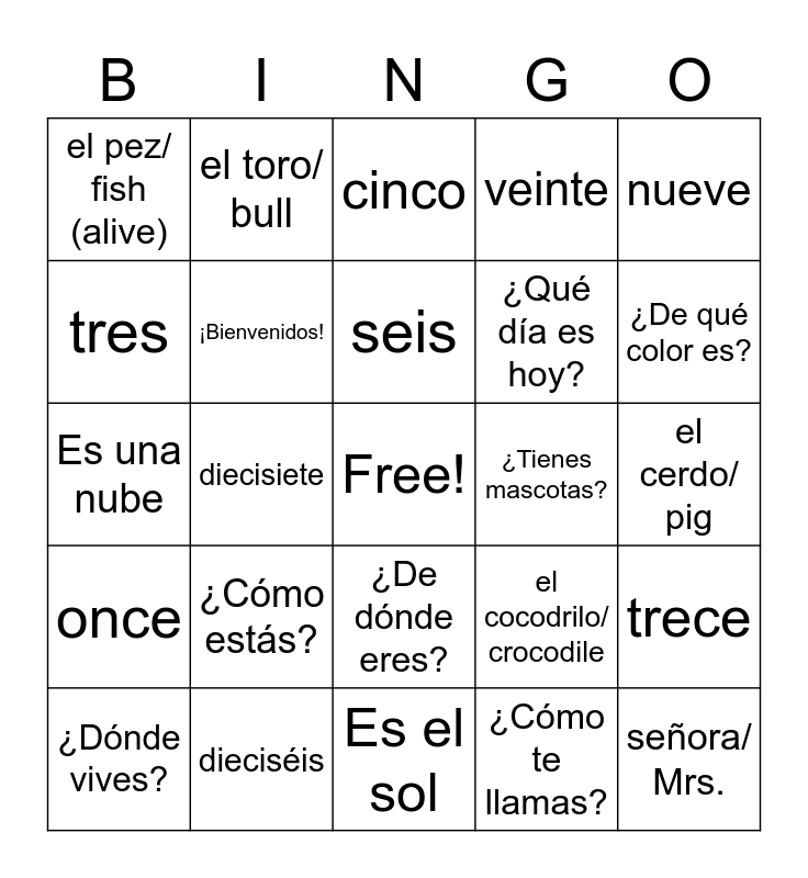 This bingo card has a free space and 44 words: día/ day, señora/ Mrs., años/ years, ¿Dónde vives?, ¿Cuantos años tienes?, ¿Cómo te llamas?, cinco, siete, nueve, dieciséis, veinte, ¿Tienes mascotas?, ¿De dónde eres?, ¿Cómo estás?, Es la luna, Es el sol, Es una estrella, Es una nube, el arcoiris, ¿De qué color es?, el toro/ bull, el pato/ duck, el perro/ dog, el pez/ fish (alive), el cangrejo/ crab, el cerdo/ pig, el pulpo/ octopus, el elefante/ elephant, el cocodrilo/ crocodile, once, doce, trece, catorce, quince, diecisiete, dieciocho, diecinueve, cuatro, seis, tres, ¿Qué día es hoy?, febrero, ¡Bienvenidos! and Me llamo.