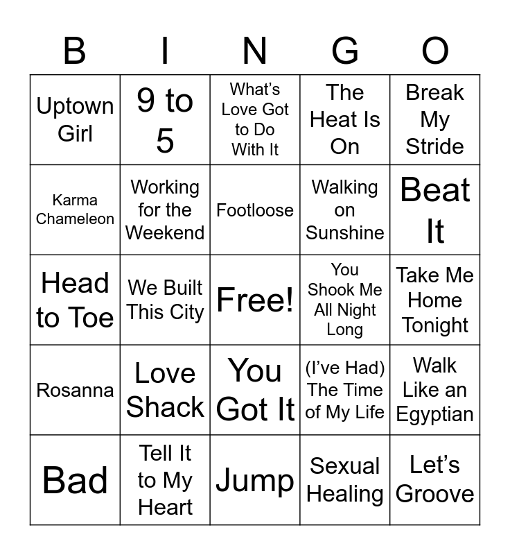 This bingo card has a free space and 66 words: Wake Me Up Before You Go-Go, Girls Just Wanna Have Fun, Eye of the Tiger, Walk Like an Egyptian, Down Under, You Got It (The Right Stuff), 9 to 5, Tell It To My Heart, Footloose, Caribbean Queen, You Got It, Let’s Hear It for the Boy, Take Me Home Tonight, Break My Stride, Who Can It Be Now, Karma Chameleon, We Built This City, Uptown Girl, Centerfold, Walking on Sunshine, Love Shack, Rosanna, The Heat Is On, Your Love, Back in Black, Sweet Dreams (Are Made of This), Jessie’s Girl, Total Eclipse of the Heart, Let’s Groove, Billie Jean, Bad, Can’t Fight This Feeling, Jump (For My Love), Hungry Heart, (I’ve Had) The Time of My Life, Tell It to My Heart, Let’s Dance, Head to Toe, Sexual Healing, Conga!, Working for the Weekend, It’s Tricky, You Shook Me All Night Long, Should I Stay or Should I Go, Bad Reputation, I’m So Excited, Beat It, Danger Zone, Rock You Like a Hurricane, You Can Call Me Al, Talking In Your Sleep, It’s Still Rock and Roll to Me, Manic Monday, Rhythm is Gonna Get You, The Warrior, Raspberry Beret, Red Red Wine, Roxanne, What’s Love Got to Do With It, Jump, Paradise City, Pour Some Sugar on Me, You Make My Dreams Come True, Rock the Casbah, Beds are Burning and Dude (Looks Like a Lady).