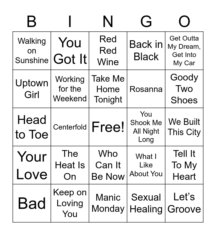 This bingo card has a free space and 65 words: Wake Me Up Before You Go-Go, Girls Just Wanna Have Fun, 9 to 5, Tell It To My Heart, Footloose, Caribbean Queen, You Got It, Let’s Hear It for the Boy, Take Me Home Tonight, Break My Stride, Who Can It Be Now, Karma Chameleon, We Built This City, Get Outta My Dream, Get Into My Car, When the Going Gets Tough, The Tough Get Going, Uptown Girl, Centerfold, Walking on Sunshine, Love Shack, Rosanna, The Heat Is On, Your Love, Back in Black, Sweet Dreams (Are Made of This), Don’t Stop Believin’, I Wanna Dance With Somebody, Jessie’s Girl, Total Eclipse of the Heart, Let’s Groove, Billie Jean, Bad, Hungry Heart, (I’ve Had) The Time of My Life, Tell It to My Heart, What I Like About You, Keep on Loving You, Let’s Dance, Head to Toe, Sexual Healing, Conga!, Working for the Weekend, It’s Tricky, You Shook Me All Night Long, Should I Stay or Should I Go, Bad Reputation, Thriller, Goody Two Shoes, I Love Rock ‘N Roll, I’m So Excited, Beat It, You Can Call Me Al, Talking In Your Sleep, It’s Still Rock and Roll to Me, Manic Monday, Rhythm is Gonna Get You, The Warrior, Raspberry Beret, Red Red Wine, Roxanne, What’s Love Got to Do With It, Jump, Paradise City, Rock the Casbah, Beds are Burning and Dude (Looks Like a Lady).