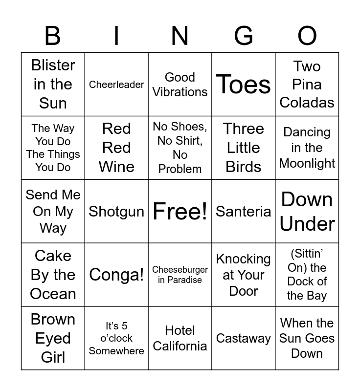 This bingo card has a free space and 60 words: Island in the Sun, It’s 5 o’clock Somewhere, Wipe Out, Cake By the Ocean, Castaway, In the Summertime, Red Red Wine, I Can See Clearly Now, Three Little Birds, Don’t Worry Be Happy, Toes, I Get Around, The Way You Do The Things You Do, Jump in the Line, Cecilia, Blister in the Sun, When the Sun Goes Down, Two Pina Coladas, Some Beach, No Shoes, No Shirt, No Problem, Santeria, Good Vibrations, Brown Eyed Girl, (Sittin’ On) the Dock of the Bay, Take On Me, Sweat (A La La La La La Long), Beers and Sunshine, Savage Love, Dancing in the Moonlight, Summer Girls, Summertime, The Tide is High, Wonderful World, Beautiful People, Sweet Sensation, Cheerleader, Beautiful Girls, Good Feeling, Shotgun, Hot, Hot, Hot, Send Me On My Way, The Sound of Sunshine, Conga!, Down Under, Summer, Knocking at Your Door, Lift Me Up, Say Hey (I Love You), Jamming, Riptide, Cheeseburger in Paradise, Hotel California, Angel, Bad Boys, Upside Down, Here Comes the Sun, Diamonds on the Soles of her Shoes, You Make Me Happy, Africa, Cruel Summer and Sounds of Summer.