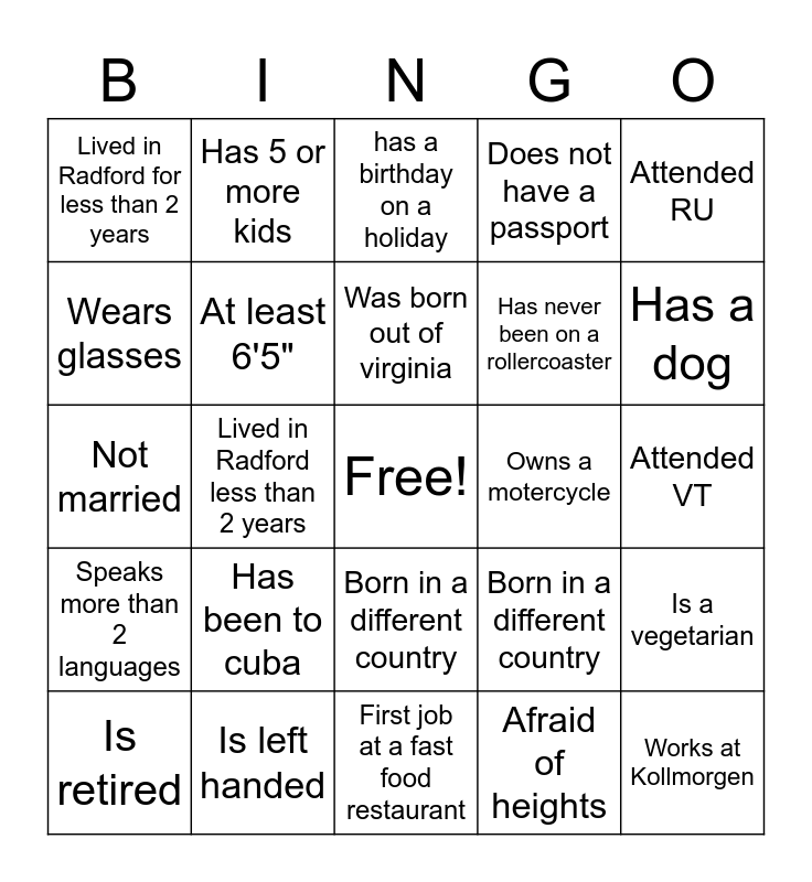 This bingo card has a free space and 24 words: Has been to cuba, Is left handed, Was born out of virginia, Is retired, Attended RU, Lived in Radford for less than 2 years, Wears glasses, Has 5 or more kids, Owns a motercycle, Born in a different country, Has never been on a rollercoaster, Not married, Born in a different country, Is a vegetarian, At least 6'5", Afraid of heights, Attended VT, has a birthday on a holiday, Has a dog, Lived in Radford less than 2 years, Works at Kollmorgen, Speaks more than 2 languages, Does not have a passport and First job at a fast food restaurant.