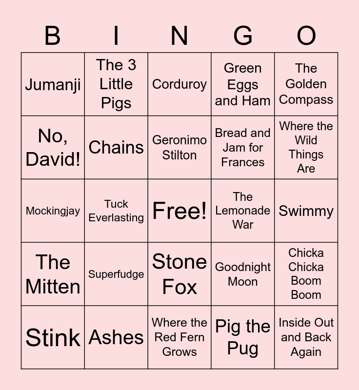 This bingo card has a free space and 114 words: Old Yeller, Diary of Anne Frank, Wonder, The Giver, Streg Nona, Harry Potter, Green Eggs and Ham, Esperanza Rising, Bud, Not Buddy, Freak the Mighty, Pinkalicious, Hatchet, Big, Big nate, maniac magee, Fancy Nancy, Stone Fox, Animal Farm, Meet Samantha, Clementine, Stink, Corduroy, Diary of a Wimpy Kid, Turn It Up, Riverman Trilogy, The Mitten, Ashes, Percy Jackson, Charlotte's Web, Wings of Fire, Where the Wild Things Are, Geronimo Stilton, Tuck Everlasting, The Outsiders, Matilda, Holes, Curious George, Dog Man, Flat Stanley, The Bronze Bow, Dragons Love Tacos, Honey, Honey, Lion!, Skippyjon Jones, Amelia Bedelia, The BFG, Pay it Forward, Pig the Pug, No, David!, Hedgie's Surprise, Ferdinand, A Series of Unfortunate Events, The Lemonade War, Lilly's Purple Plastic Purse, Smile, Olivia, The House on Mango Street, Amulet, Ramona the Pest, Lon Po Po, Pete the Cat, Chicka Chicka Boom Boom, The Hunger Games, Black Beauty, Ramona and Beezus, George and Martha, Magic Tree House, Eloise, Chains, Mockingjay, Mr. Popper's Penguins, Swimmy, Stuart Little, Harriet the Spy, The Tale of Despereaux, I Am Malala, Inside Out and Back Again, Superfudge, Jumanji, The Wind in the Willows, Wayside School Series, The Narnia Trilogy, The 3 Little Pigs, Pink and Say, Goodnight Moon, Bread and Jam for Frances, Owl Moon, Frog and Toad are Friends, The Borrowers, The Cat in the Hat, Number the Stars, The Paper Bag Princess, Island of the Blue Dolphins, The Snowy Day, The Golden Compass, Chrysanthemum, The Hobbit, Click, Clack, Moo!, Sounder, Sarah, Plain and Tall, The Phantom Tollbooth, Wemberly Worried, Bridge to Terabithia, Because of Winn Dixie, The Lorax, The Lightning Thief, Miss Nelson is Missing, Caps for Sale, Where the Red Fern Grows, The Westing Game, A Wrinkle in Time, The Giving Tree, Romeo and Juliet, Walk Two Moons and Stone Soup.