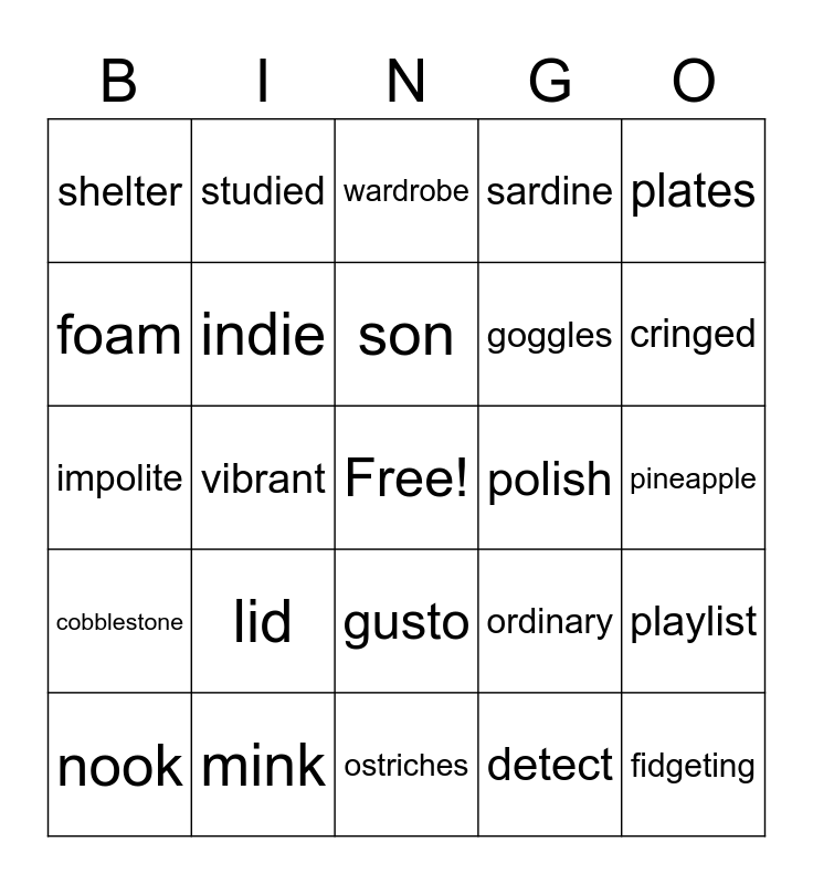 This bingo card has a free space and 24 words: lid, mink, son, nook, plates, shelter, foam, studied, polish, gusto, goggles, impolite, ordinary, playlist, indie, detect, pineapple, wardrobe, cringed, vibrant, fidgeting, cobblestone, sardine and ostriches.