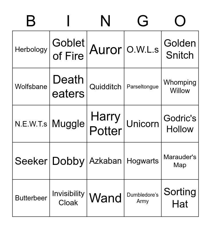 This bingo card has a free space and 24 words: Dobby, Invisibility Cloak, Quidditch, Butterbeer, Golden Snitch, Herbology, Wolfsbane, Goblet of Fire, Unicorn, Azkaban, Parseltongue, N.E.W.T.s, Hogwarts, Marauder's Map, Death eaters, Dumbledore’s Army, Godric's Hollow, Auror, Whomping Willow, Muggle, Sorting Hat, Seeker, O.W.L.s and Wand.