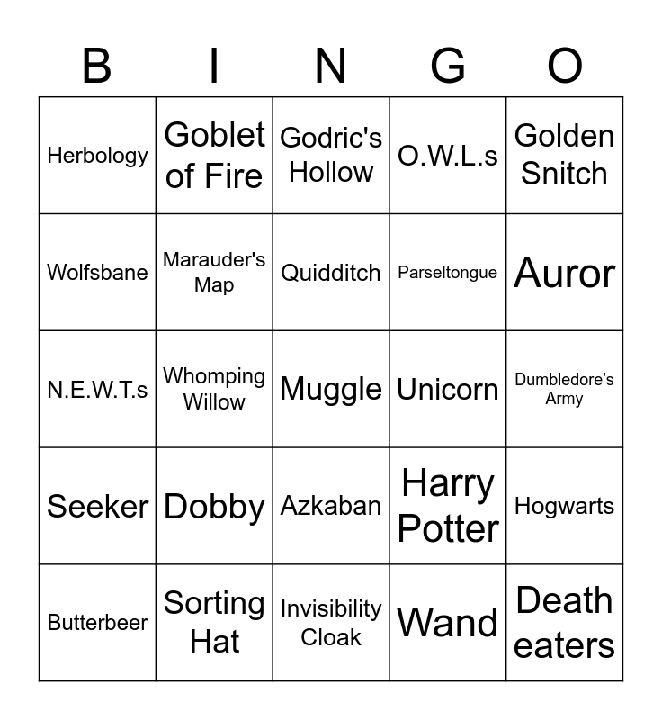 This bingo card has 25 words: Dobby, Invisibility Cloak, Quidditch, Butterbeer, Golden Snitch, Herbology, Wolfsbane, Goblet of Fire, Unicorn, Azkaban, Parseltongue, N.E.W.T.s, Harry Potter, Hogwarts, Marauder's Map, Death eaters, Dumbledore’s Army, Godric's Hollow, Auror, Whomping Willow, Muggle, Sorting Hat, Seeker, O.W.L.s and Wand.