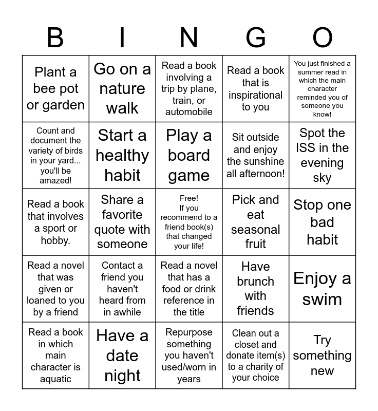 This bingo card has a free space and 24 words: Read a book in which main character is aquatic, Contact a friend you haven't heard from in awhile, Play a board game, Clean out a closet and donate item(s) to a charity of your choice, You just finished a summer read in which the main character reminded you of someone you know!, Plant a bee pot or garden, Go on a nature walk, Read a book involving a trip by plane, train, or automobile, Pick and eat seasonal fruit, Stop one bad habit, Read a book that involves a sport or hobby., Start a healthy habit, Have brunch with friends, Enjoy a swim, Count and document the variety of birds in your yard... you'll be amazed!, Have a date night, Repurpose something you haven't used/worn in years, Read a book that is inspirational to you, Spot the ISS in the evening sky, Read a novel that was given or loaned to you by a friend, Share a favorite quote with someone, Read a novel that has a food or drink reference in the title, Sit outside and enjoy the sunshine all afternoon! and Try something new.