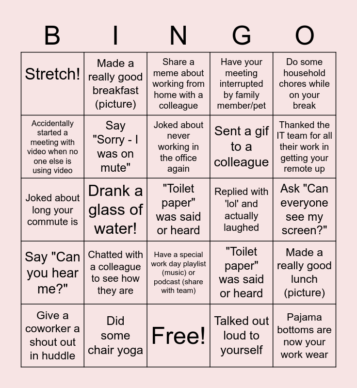This bingo card has 26 words: Say "Can you hear me?", Did some chair yoga, Joked about never working in the office again, Talked out loud to yourself, Do some household chores while on your break, Stretch!, Say "Sorry - I was on mute", Share a meme about working from home with a colleague, Sent a gif to a colleague, Pajama bottoms are now your work wear, Accidentally started a meeting with video when no one else is using video, Drank a glass of water!, Free!, "Toilet paper" was said or heard, Ask "Can everyone see my screen?", Forgot to brush your teeth this morning, Made a really good breakfast (picture), Have a special work day playlist (music) or podcast (share with team), Have your meeting interrupted by family member/pet, Made a really good lunch (picture), Joked about long your commute is, Chatted with a colleague to see how they are, "Toilet paper" was said or heard, Replied with 'lol' and actually laughed, Thanked the IT team for all their work in getting your remote up and Give a coworker a shout out in huddle.