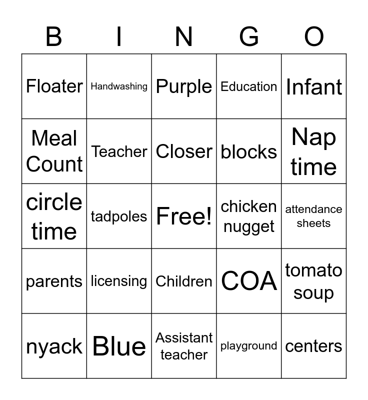 This bingo card has a free space and 29 words: COR %, Blue, Purple, Orange, Infant, Floater, Teacher, Closer, chicken nugget, tomato soup, nyack, tadpoles, playground, centers, circle time, bentley, Assistant teacher, COA, Nap time, parents, licensing, laminator, blocks, attendance sheets, Meal Count, Handwashing, Children, Education and PEEEPS.