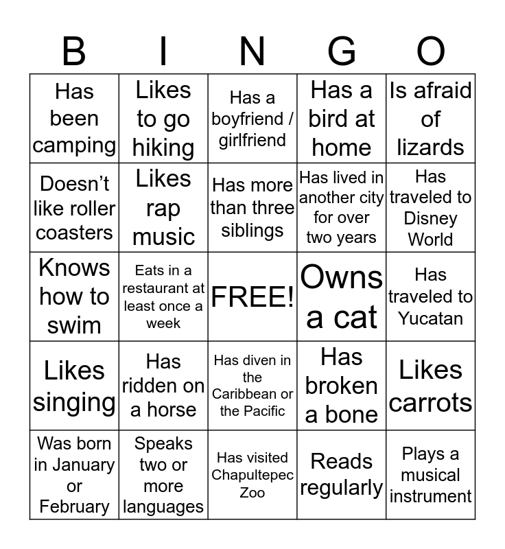 This bingo card has a free space and 24 words: Has ridden on a horse, Speaks two or more languages, Has more than three siblings, Was born in January or February, Is afraid of lizards, Has been camping, Doesn’t like roller coasters, Likes to go hiking, Owns a cat, Has diven in the Caribbean or the Pacific, Has lived in another city for over two years, Knows how to swim, Has broken a bone, Likes carrots, Likes rap music, Reads regularly, Has traveled to Yucatan, Has a boyfriend / girlfriend, Has traveled to Disney World, Eats in a restaurant at least once a week, Plays a musical instrument, Likes singing, Has a bird at home and Has visited Chapultepec Zoo.
