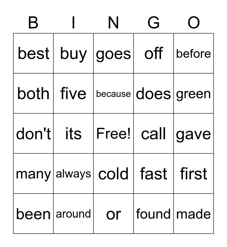 This bingo card has a free space and 24 words: always, around, because, been, before, best, both, buy, call, cold, does, don't, fast, first, five, found, gave, goes, green, its, made, many, off and or.