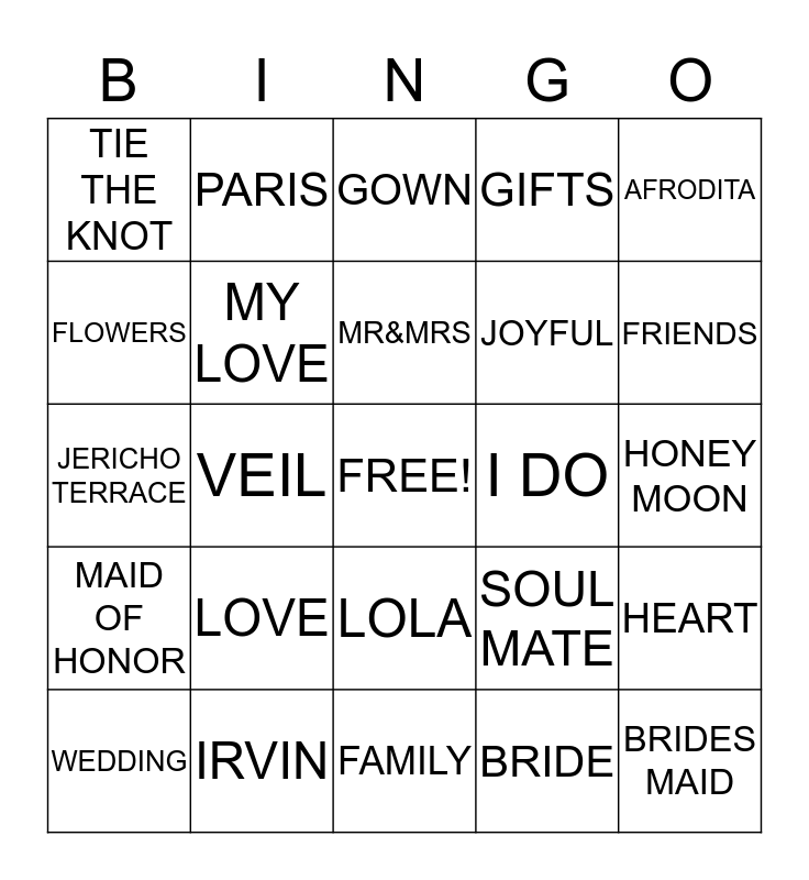 This bingo card has a free space and 24 words: LOVE, IRVIN, MR&MRS, WEDDING, AFRODITA, TIE THE KNOT, FLOWERS, PARIS, I DO, LOLA, JOYFUL, JERICHO TERRACE, SOUL MATE, HEART, MY LOVE, BRIDE, HONEY MOON, GOWN, FRIENDS, VEIL, BRIDES MAID, MAID OF HONOR, GIFTS and FAMILY.