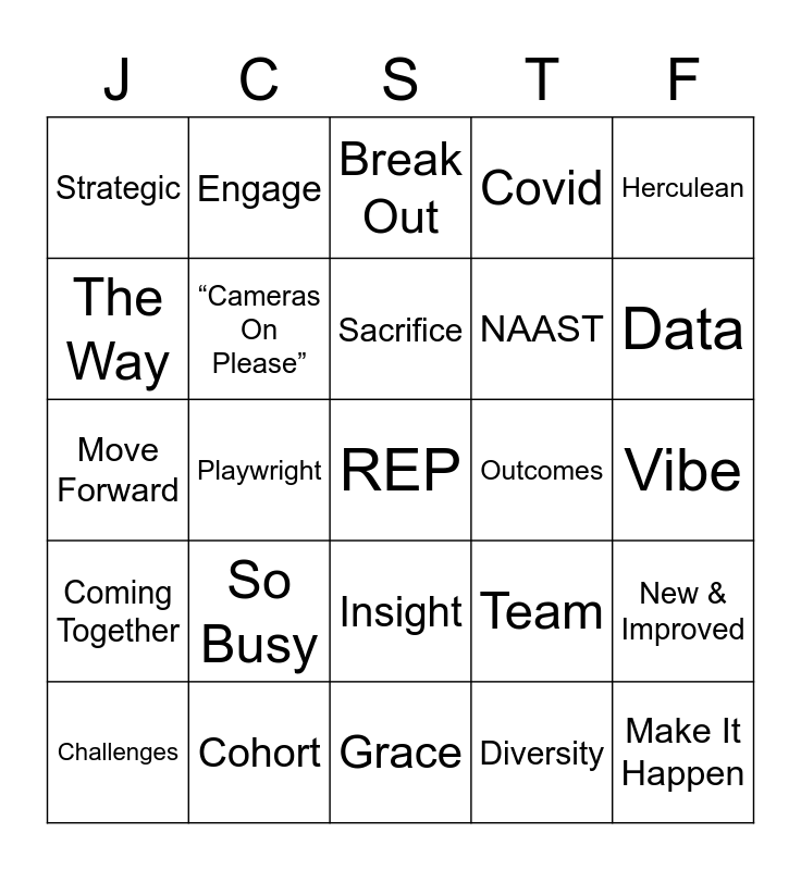 This bingo card has a free space and 43 words: Inspired, Make It Happen, Real Change, Challenges, Sensitive, Diversity, Break Out, Listening, Herculean, Cohort, Covid, Outcomes, Insight, So Busy, You Matter, Grace, Center, Move Forward, Phase, Data, Engage, Lift Up, Next Steps, Strategic, Manifest, Vibe, Spicy, Grieving, Team, Coming Together, X Seconds of Silence, New & Improved, “Hashtag”, Playwright, Journey, Glow Big Red, Involvement, Sacrifice, The Way, NAAST, “Leader” of group not present, “Cameras On Please” and Johnny Carson (Not school).