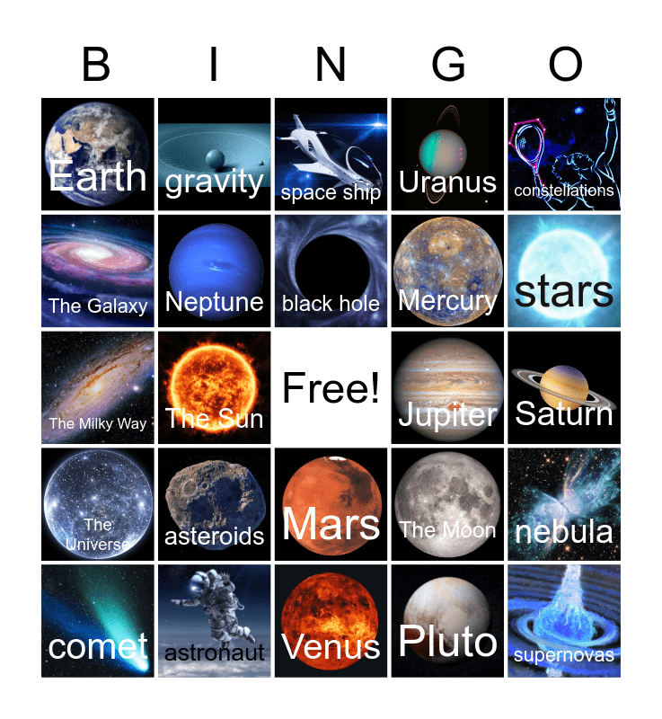 This bingo card has 24 images, a free space and 24 words: asteroids, astronaut, black hole, comet, constellations, Earth, The Galaxy, gravity, Jupiter, Mars, Mercury, The Milky Way, The Moon, nebula, Neptune, Pluto, Saturn, space ship, stars, The Sun, supernovas, The Universe, Uranus and Venus.