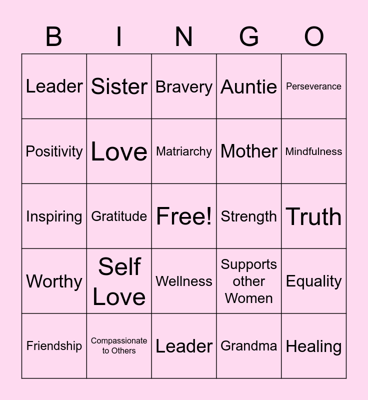 This bingo card has a free space and 24 words: Self Love, Compassionate to Others, Matriarchy, Friendship, Perseverance, Leader, Positivity, Sister, Strength, Wellness, Mother, Inspiring, Supports other Women, Equality, Love, Grandma, Truth, Bravery, Mindfulness, Gratitude, Healing, Worthy, Auntie and Leader.