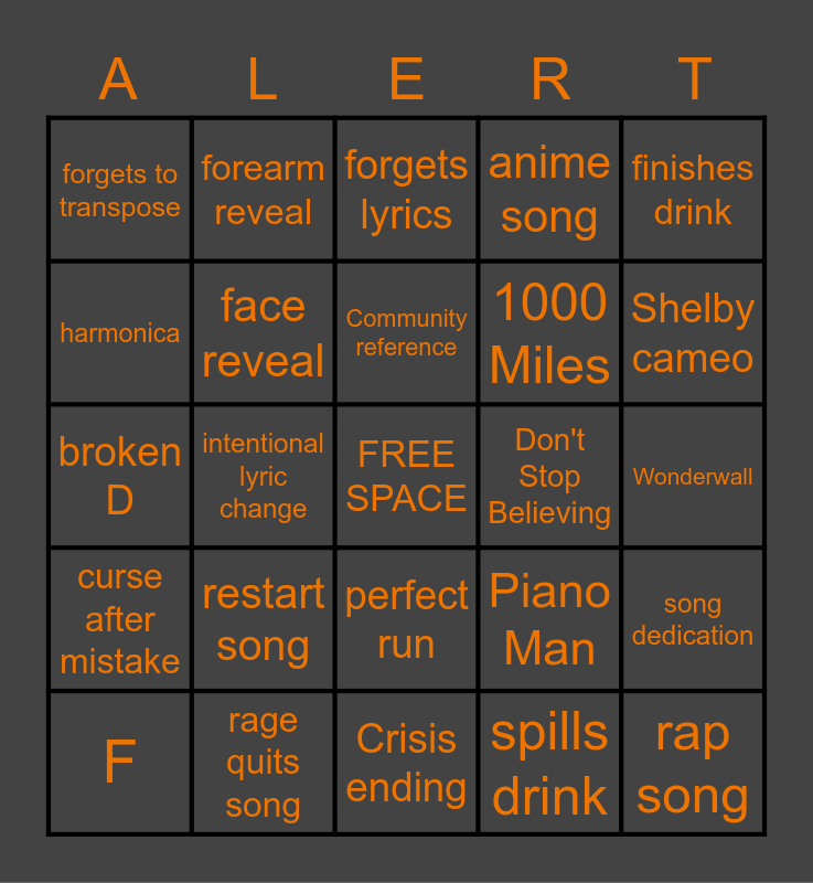 This bingo card has a free space and 24 words: restart song, rage quits song, Community reference, F, finishes drink, forgets to transpose, harmonica, forearm reveal, Don't Stop Believing, perfect run, 1000 Miles, broken D, Piano Man, song dedication, face reveal, spills drink, Wonderwall, forgets lyrics, Shelby cameo, intentional lyric change, rap song, curse after mistake, anime song and Crisis ending.