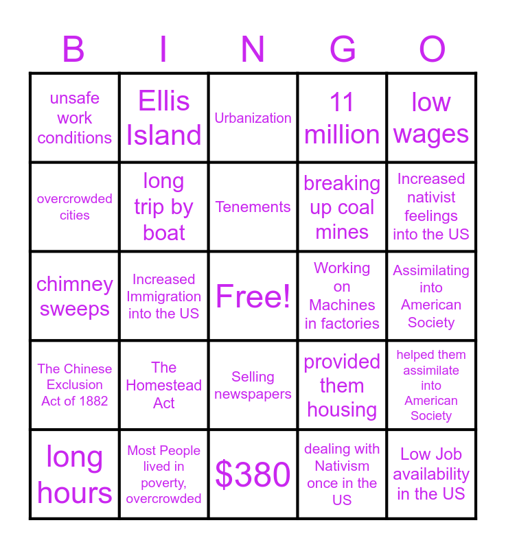 This bingo card has a free space and 24 words: The Homestead Act, Most People lived in poverty, overcrowded, Tenements, long hours, low wages, unsafe work conditions, overcrowded cities, Ellis Island, Working on Machines in factories, Selling newspapers, breaking up coal mines, chimney sweeps, provided them housing, helped them assimilate into American Society, long trip by boat, dealing with Nativism once in the US, Assimilating into American Society, Urbanization, Increased nativist feelings into the US, Increased Immigration into the US, Low Job availability in the US, The Chinese Exclusion Act of 1882, 11 million and $380.