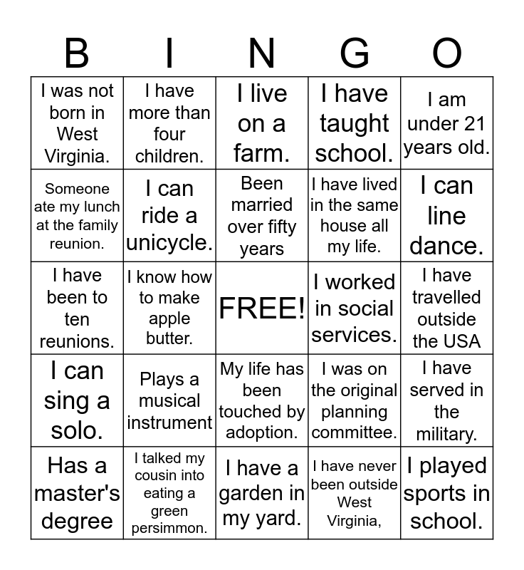 This bingo card has a free space and 24 words: Plays a musical instrument, I talked my cousin into eating a green persimmon., Been married over fifty years, Has a master's degree, I am under 21 years old., I was not born in West Virginia., Someone ate my lunch at the family reunion., I have more than four children., I worked in social services., My life has been touched by adoption., I have lived in the same house all my life., I have been to ten reunions., I was on the original planning committee., I have served in the military., I can ride a unicycle., I have never been outside West Virginia,, I have travelled outside the USA, I live on a farm., I can line dance., I know how to make apple butter., I played sports in school., I can sing a solo., I have taught school. and I have a garden in my yard..